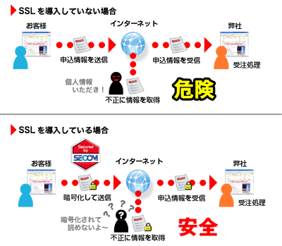 また、各利用端末と実際にデータを保管しているサーバーの間は社内専用のネットワークで接続され、更に128 bit SSLで暗号化を行い通信をしています。 万が一のデータを盗聴などによりコピーされたとしても、暗号化されている為、内容を見ることはできません。 セコムのSSL暗号化で安心ってどうゆうこと?お客様の情報をお守りする為、弊社はセコムのSSL認証サービスを導入しています。 お客様の情報はすべて暗号化されますので、安心してご利用頂けます。 SSLに対応していない会社は危険です!!よくご確認下さい。 |
